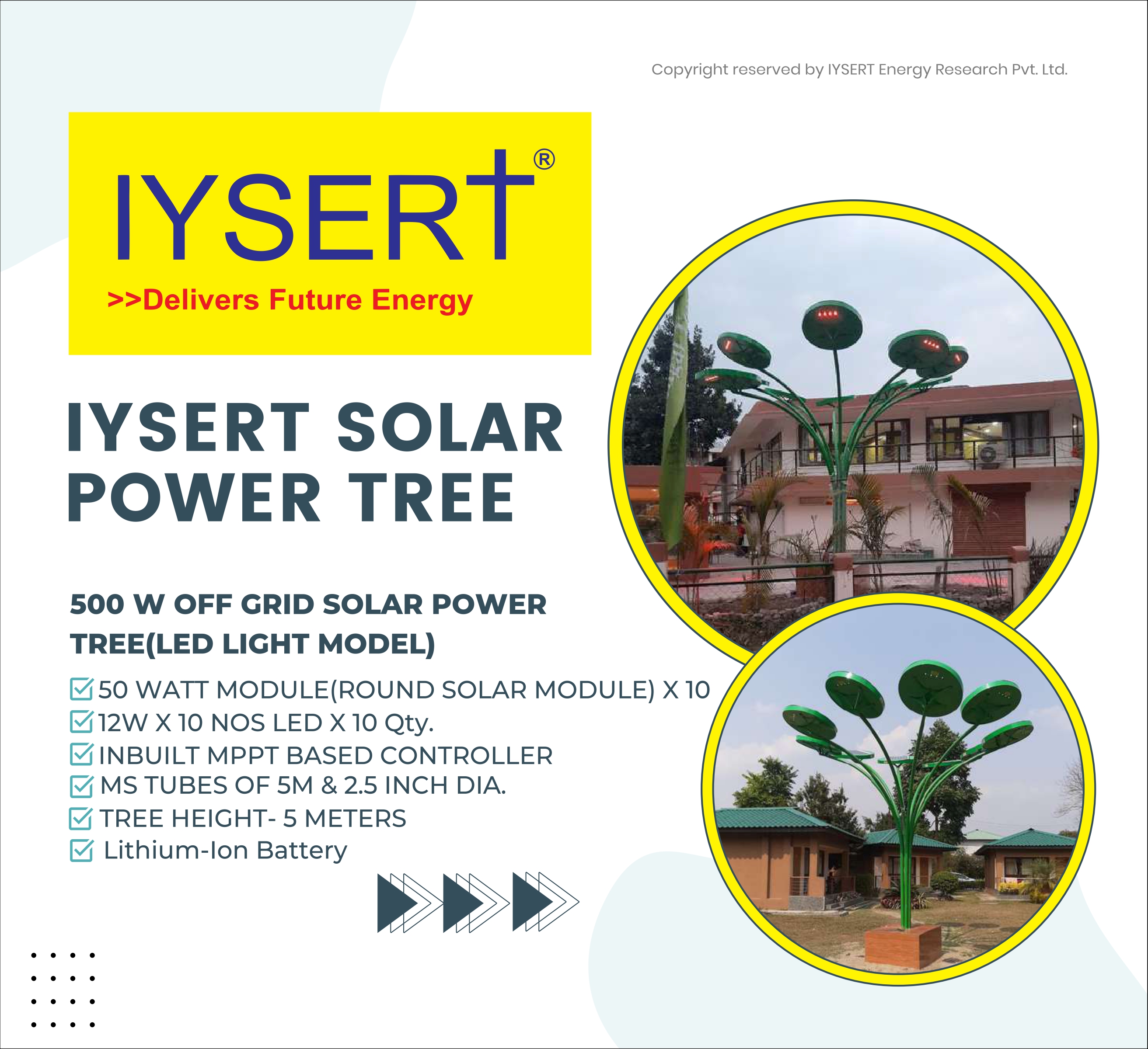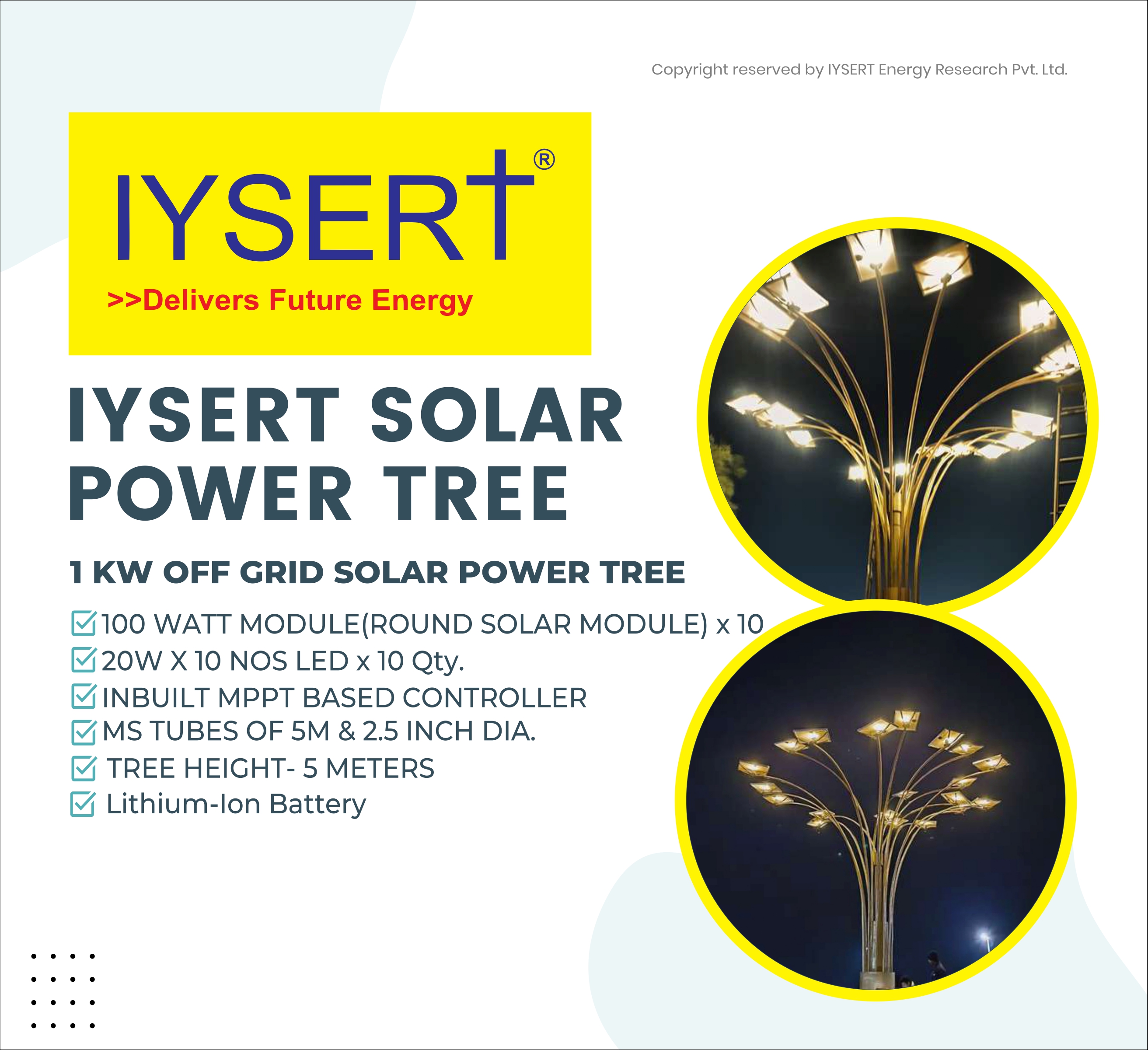 Iysert is the Manufacturer of Smart Portable solar Power Tree Model Range from 500 watt - 10 kw and Approved Vendor for Smart City ,Government of India. Approved Channel Partner with MNRE , Indian Railways , Gujarat Housing Board , Jodhpur , Jaisalmer Nagar Nigam, Bareilly Smarct City , Dehradun Smart City , Lucknow Smart City , Gujarat Smart City Projects.