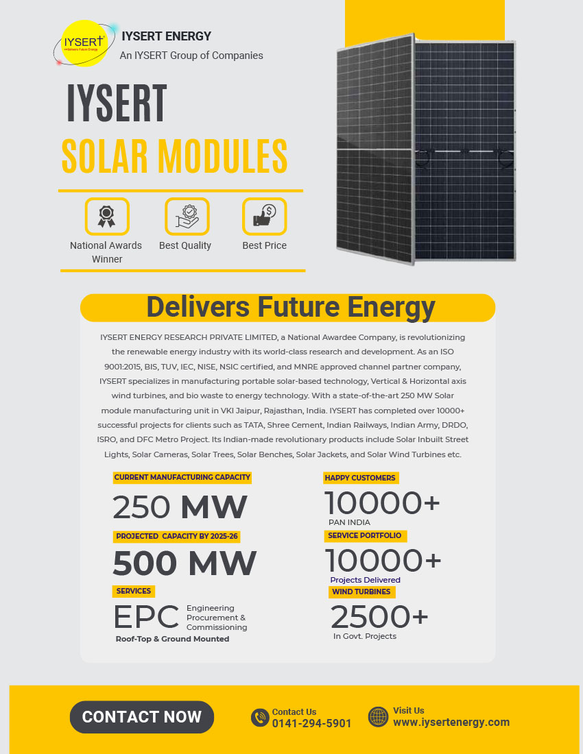 We IYSERT Group of Companies having State of an Art 200 MW Semi Automatic Solar Modules manufacturers Unit in VKI 13 , Jaipur Rajasthan & manufacturers all types of solar modules ranging from 50w to 650W ( Top Con Bifacial ) , BIPV modules , Flexible modules for the reputed OEMS across the world .