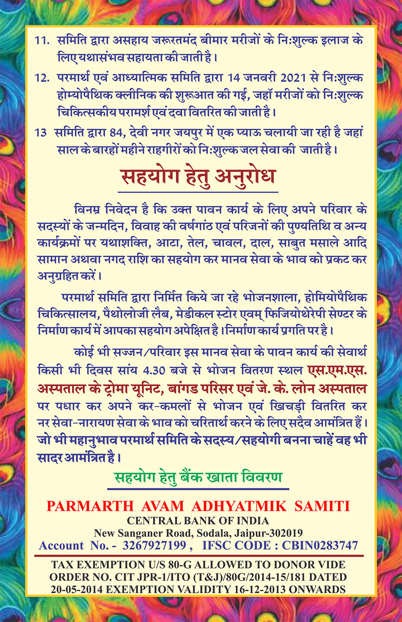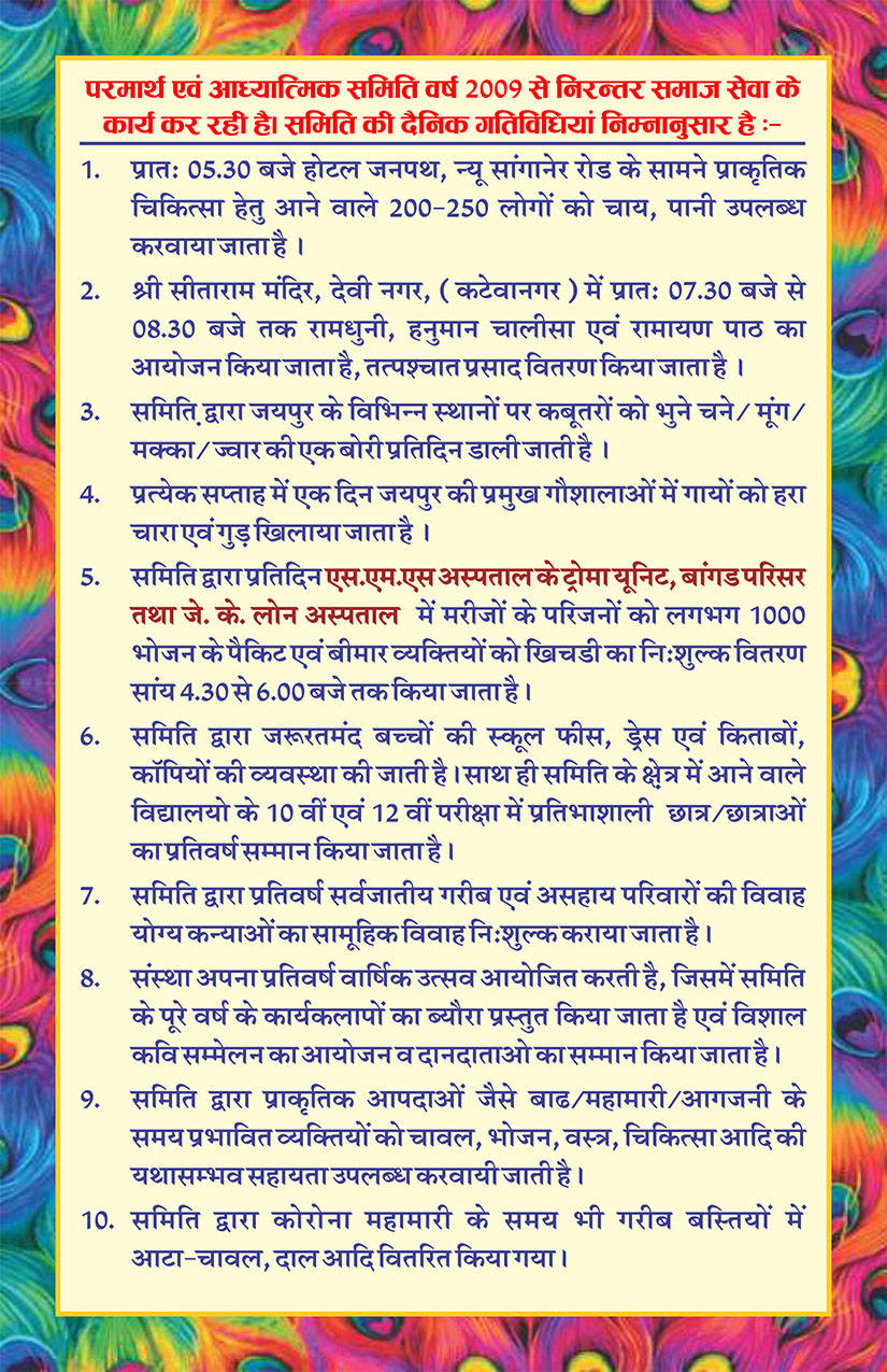 1. Regularly serves free meals to more than 500 patient attendant 365 days at evening 5pm - 6pm at SMS Hospital Jaipur & JK lone Hospital,Jaipur