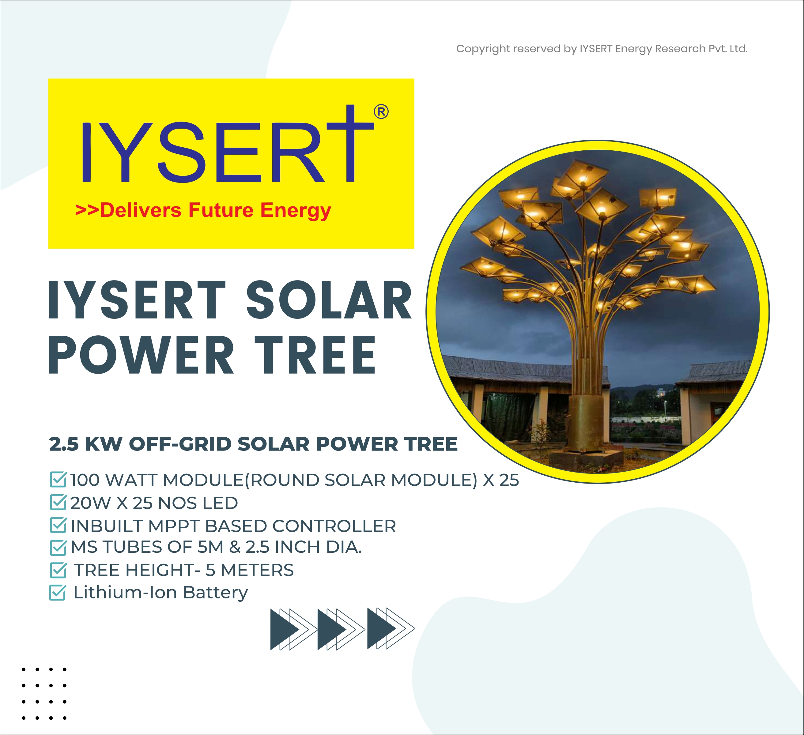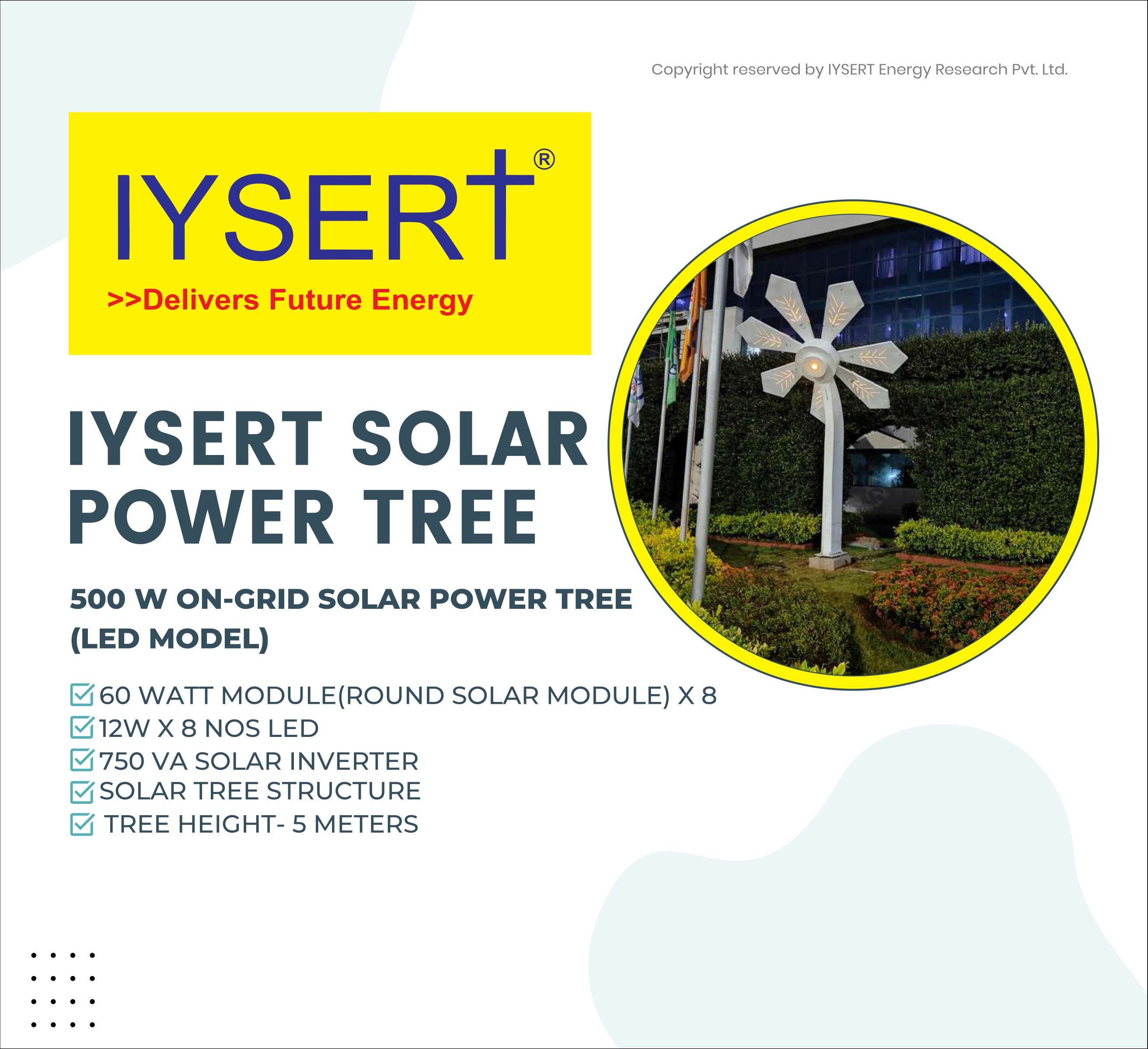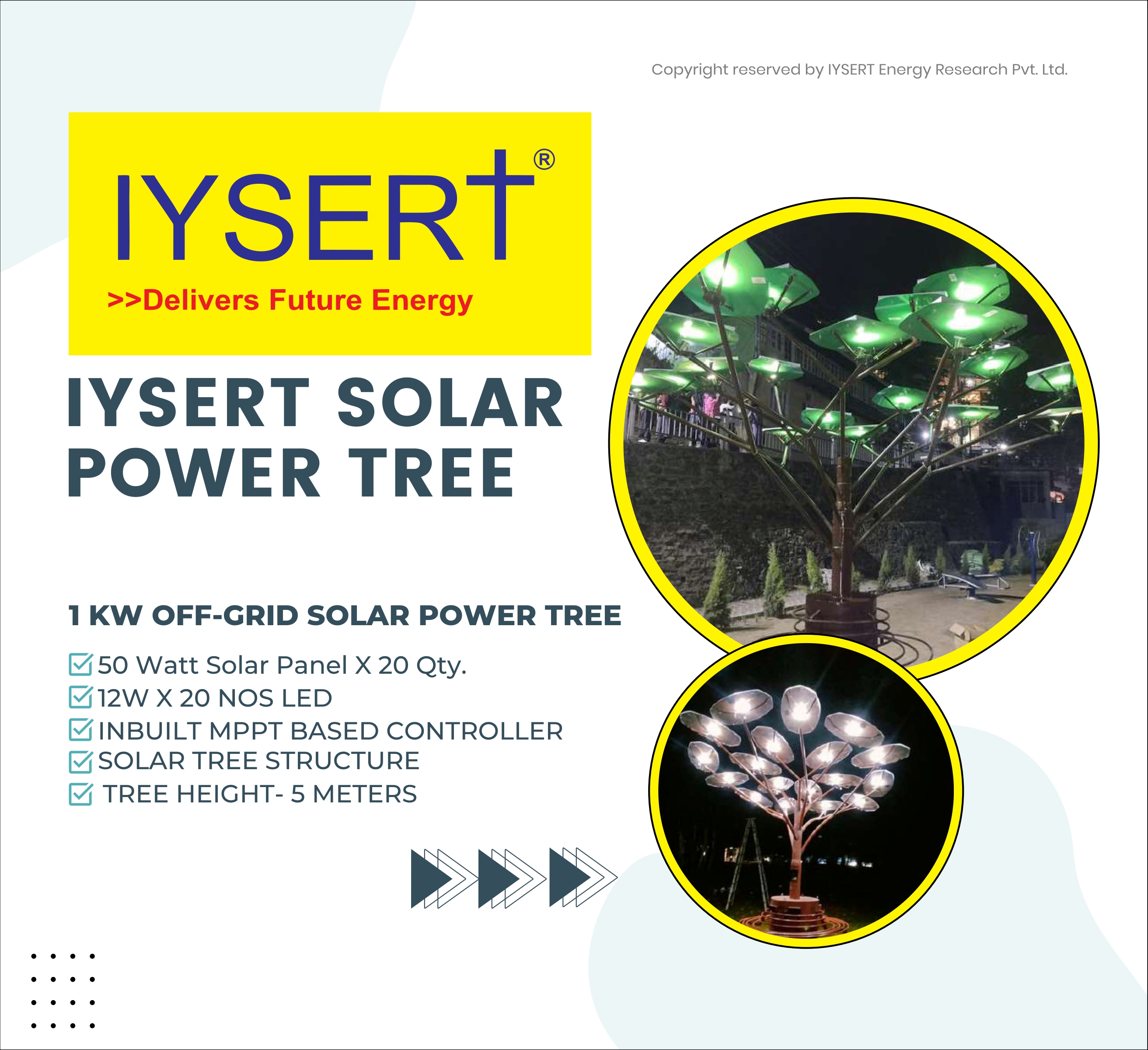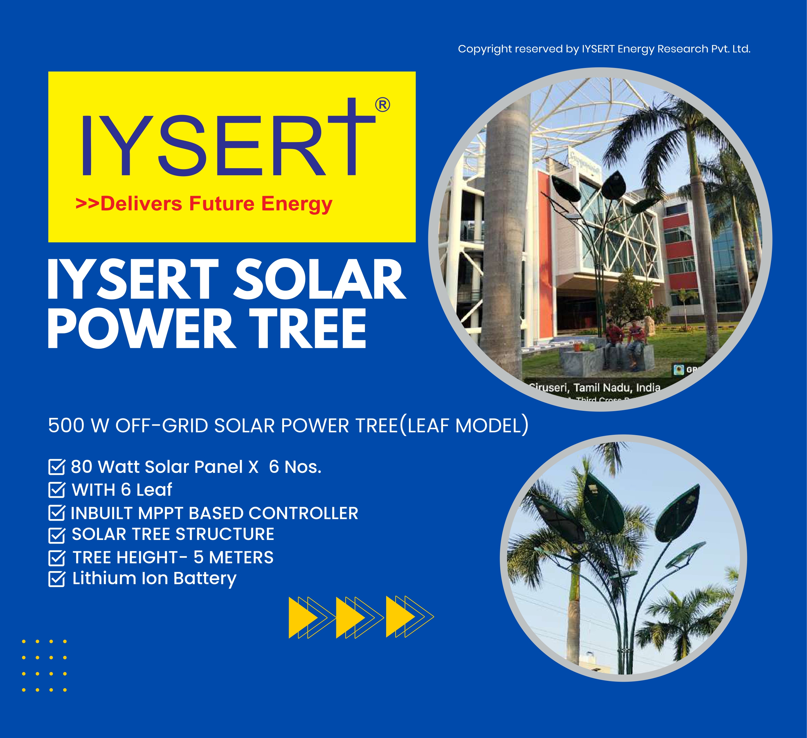 Iysert is the Manufacturer of Smart Portable solar Power Tree Model Range from 500 watt - 10 kw and Approved Vendor for Smart City ,Government of India. Approved Channel Partner with MNRE , Indian Railways , Gujarat Housing Board , Jodhpur , Jaisalmer Nagar Nigam, Bareilly Smarct City , Dehradun Smart City , Lucknow Smart City , Gujarat Smart City Projects.