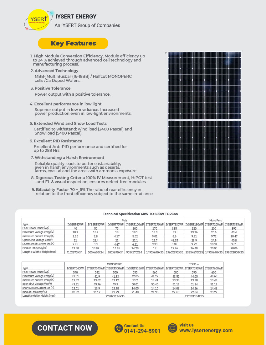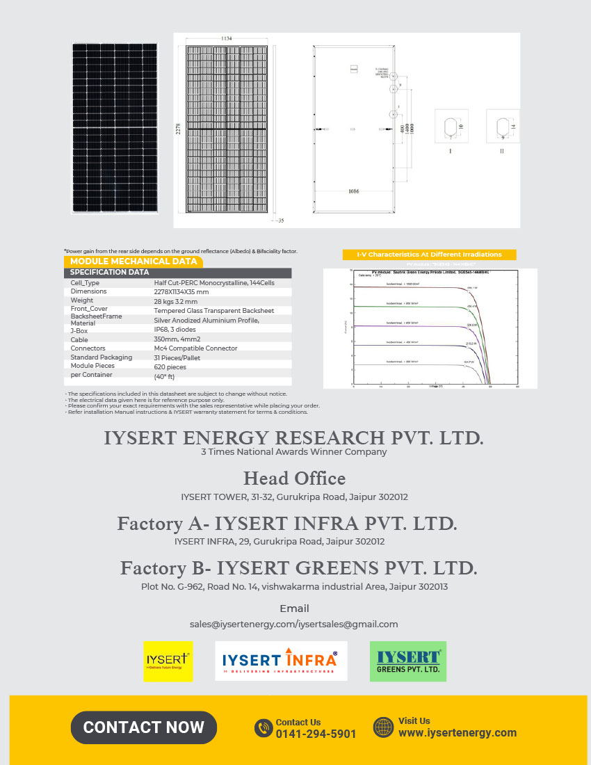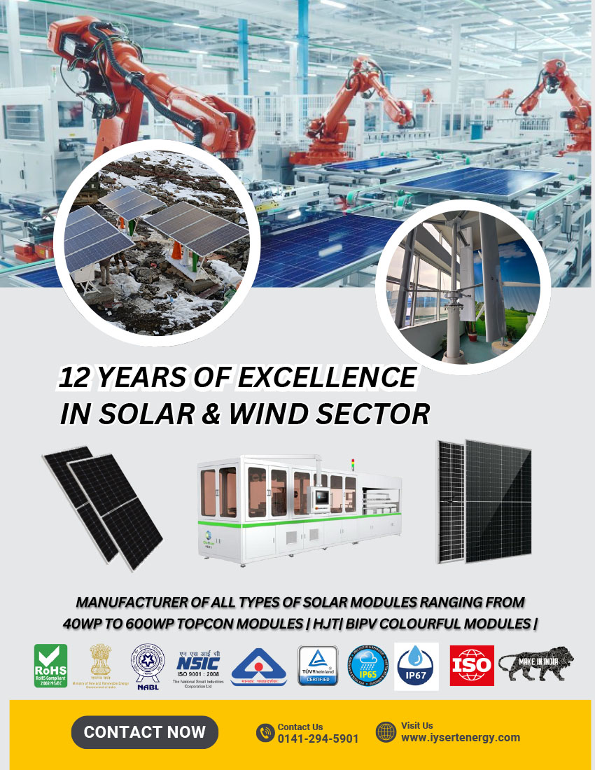 We IYSERT Group of Companies having State of an Art 200 MW Semi Automatic Solar Modules manufacturers Unit in VKI 13 , Jaipur Rajasthan & manufacturers all types of solar modules ranging from 50w to 650W ( Top Con Bifacial ) , BIPV modules , Flexible modules for the reputed OEMS across the world .